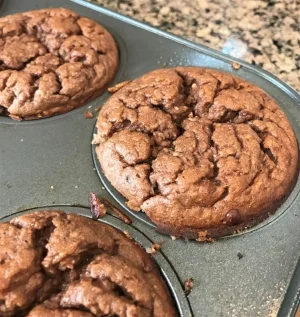 - Divide mixture evenly into muffin tins, either with liners or spray with PAM (Recipe makes 12 standard sized muffins).